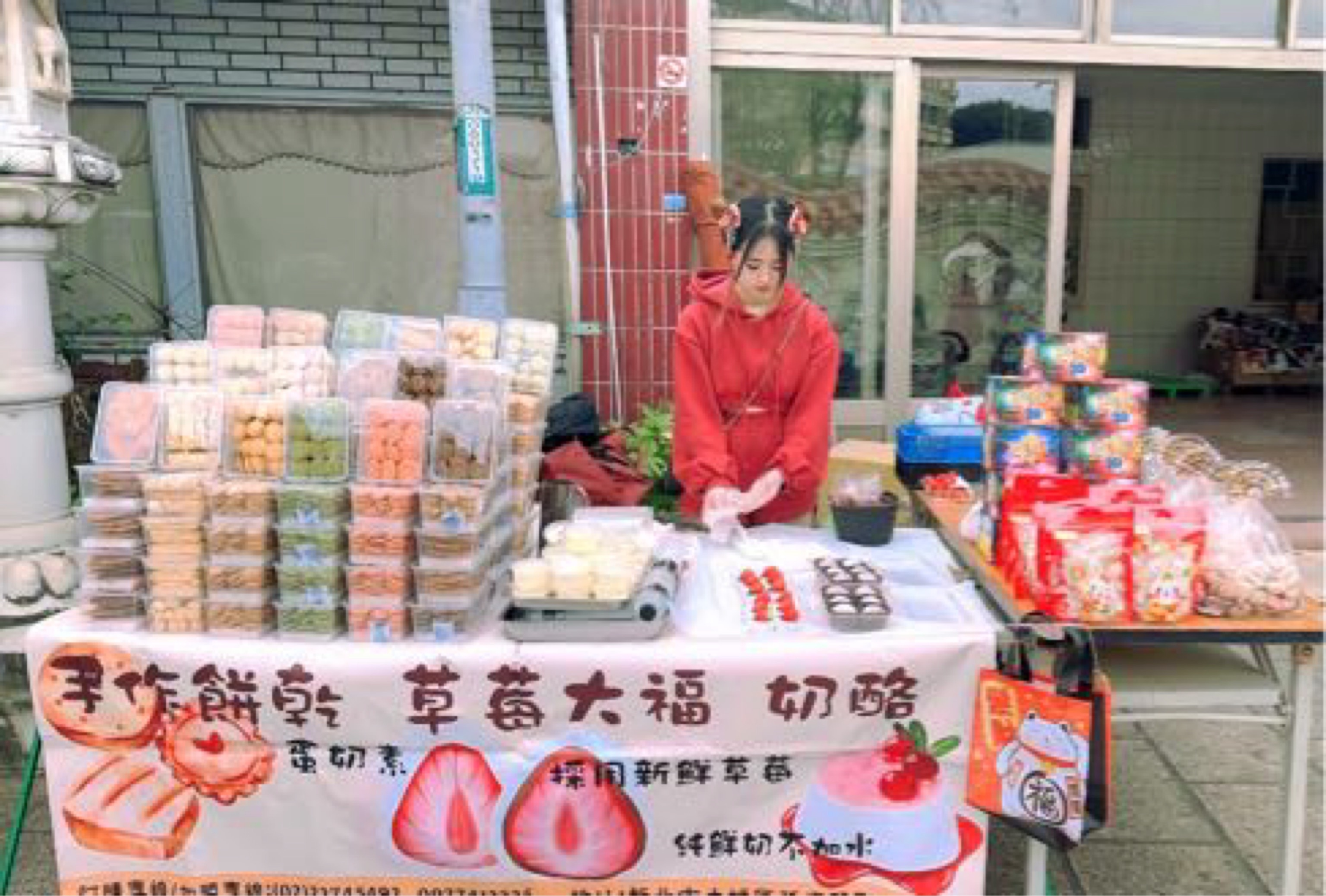 在龜山壽山巖觀音寺嶺頂廟發現一個妹妹在這裡擺手作餅乾.草莓大福!好好吃啊餅乾不會太甜一邊看電視一邊吃我一個能炫1盒,他的草莓大福跟奶酪也是一級棒的非常濃郁月oO